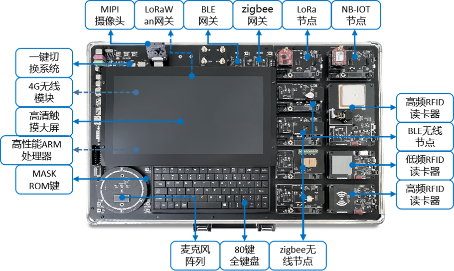 整個教學平臺包括物聯(lián)網(wǎng)、嵌入式Linux和人工智能(AI),三個部分互相支撐、互為補充。人工智能部分的硬件基于嵌入式ARM控制器、高清相機模塊、7麥麥克風陣列,具備語音、圖像數(shù)據(jù)的采集和處理能力及適用于多種場景的控制接口;嵌入式Linux部分的硬件采用CPU+GPU雙處理器架構,配備高清大屏以及豐富的外設接口;物聯(lián)網(wǎng)部分的硬件支持RFID、Zigbee、Ble、Lora、NBIoT等無線傳輸技術以及20余種傳感器模塊。