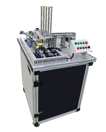 物料供給教學(xué)實(shí)訓(xùn)平臺(tái)由PLC、移動(dòng)型材工作臺(tái)、控制屏、多通道井式供料機(jī)、帶式傳輸機(jī)構(gòu)、智能接口單元及控制面板、氣路控制裝置等組成。