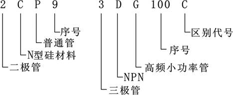 半導(dǎo)體器件的型號(hào)由五部分組成:第一部分用數(shù)字表示半導(dǎo)體管的電極數(shù);第二部分用拉丁字母表示半導(dǎo)體管的材料和極性;第三部分用拉丁字母表示半導(dǎo)體管的類(lèi)別;第四部分用拉丁字母表示序號(hào),第五部分用拉丁字母表示區(qū)別代號(hào)。半導(dǎo)體器件型號(hào)前三部分的含義見(jiàn)表7,半導(dǎo)體器件型號(hào)識(shí)別示例如圖2-2-9所示。