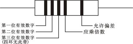 四環(huán)色標(biāo)是在五環(huán)基礎(chǔ)上去除第三環(huán);三環(huán)色標(biāo)是在五環(huán)基礎(chǔ)上去除第三環(huán)和第五環(huán),這時(shí)允許偏差約定為±20%。色標(biāo)的含義見(jiàn)表2-2-3