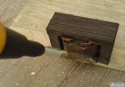 1把變壓器夾在臺(tái)虎鉗上面,不是全夾,夾住大部分,留出若干片鐵心(至少3--5片)不夾。沒有臺(tái)鉗,可以找塊木版,把變壓器放在上面,邊緣也是留出幾片鐵心的位置懸空。如圖1-2。