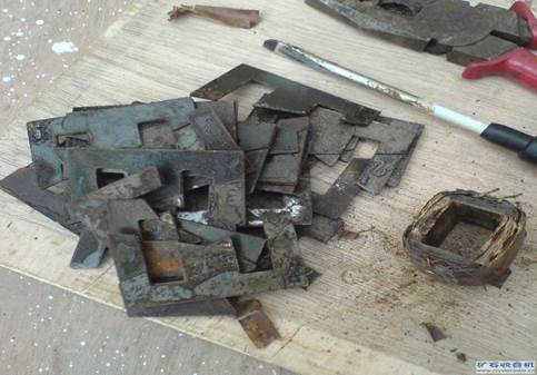 5、 接下來用起子慢慢連敲帶撬,讓那一兩片鐵心加大位移,直到從線包中完全脫離出來。如圖1-6。