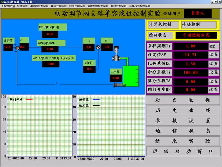 9.點擊“確認(rèn)”,用戶登錄完畢。選擇“單回路控制實驗”下拉菜單中的“電動閥支路單容液位控制實驗”,出現(xiàn)如圖3.10所示的“電動閥支路單容液位控制實驗”界面。