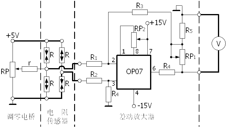 將四個(gè)應(yīng)變片電阻分別接入電橋的四個(gè)橋臂,兩相鄰的應(yīng)變片電阻的受力方向不同,組成全橋形式的測量電路,轉(zhuǎn)換電路的輸出靈敏度進(jìn)一步提高,非線性得到改善。實(shí)驗(yàn)電路圖見圖3-1,全橋的輸出電壓UO=4EKε
