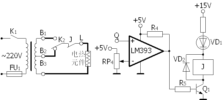 當(dāng)UO達(dá)到2V時(shí),繼電器J吸合,斷開加熱電源,但溫度仍會(huì)繼續(xù)稍有上升,然后下降。當(dāng)UO降到2V左右時(shí),繼電器J斷開,接通加熱電源,溫度仍會(huì)繼續(xù)稍有下降,然后上升。經(jīng)過幾次這樣的循環(huán),溫度變化范圍會(huì)穩(wěn)定下來。