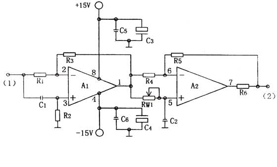 A1與C1、R2組成有源微分網(wǎng)絡(luò),A2與RW1、C2組成有源積分網(wǎng)絡(luò),當(dāng)①端輸入天弦交流信號(hào)μm時(shí),A1輸出一超前μm相位信號(hào),A2輸出一滯后μm相位的信號(hào),通過調(diào)節(jié)RW1可使輸出信號(hào)與輸入信號(hào)相位發(fā)生變化。