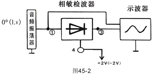 2、根據(jù)圖49-2的電路接一,將音頻振蕩器的信號(hào)0°輸出端輸出至相敏檢波器輸入端①,把直流穩(wěn)壓電源+2V輸出接至相敏檢波器的參考輸入端④把示波器兩根輸入線分別接至相敏檢波器的輸入端①和輸出端③組成一個(gè)測量線路。