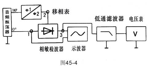 7、關(guān)閉電源,根據(jù)圖49-4的電路重新接線,將音頻振蕩器的信號(hào)從0°端輸出至相敏檢波器的輸入端①,180°端輸出接至移相器的輸入端,把移相器輸出端接至相敏檢波器的參輸入端②,把不波器的兩根輸入線分別接至相敏檢波器的輸入端①和輸出端③同時(shí)與低通濾波器輸入端連接起來,將低通濾波器輸出端與直流電壓表連接上來,組成一測量線路。