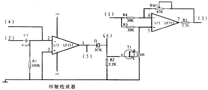 當(dāng)②或④端輸入控制電壓信號(hào)時(shí),通過開環(huán)放大器的作用使場效應(yīng)晶體管處于開關(guān)狀態(tài)。從而把①端輸入的正弦信號(hào)轉(zhuǎn)撳與控制信號(hào)有關(guān)的檢波信號(hào)。