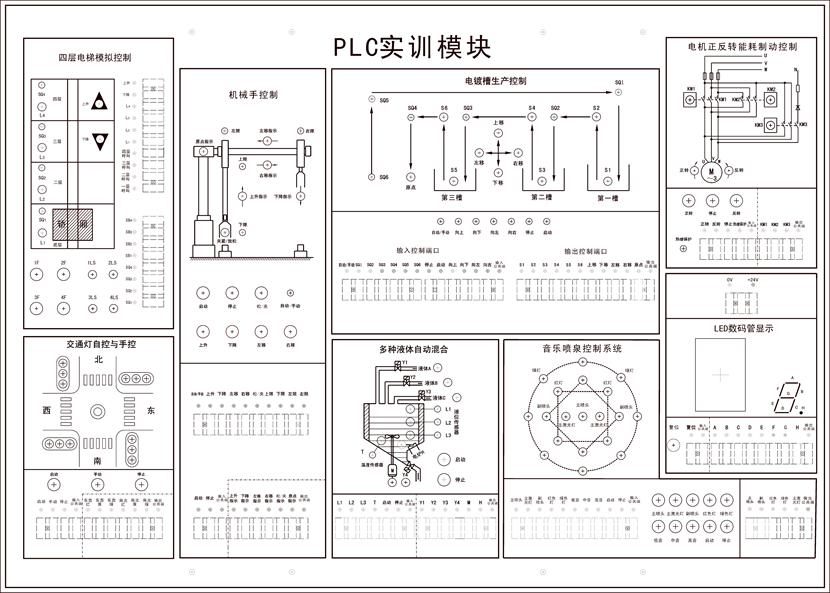 PLC實訓模塊是由LED指示燈和按鈕開關(guān)組成的控制模擬單元,每個單元都有不同的實訓內(nèi)容,模擬了不同的工業(yè)現(xiàn)場,其工作電壓為DC24V,實驗導線連接如如例所示