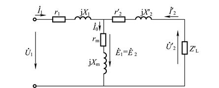 經(jīng)過折算繞組,可得變壓器的部分等效電路,如圖3-16(a)所示。其中一、二次側(cè)之間的耦合作用,由主磁通在繞組中產(chǎn)生的感應(yīng)電動(dòng)勢(shì),反映出來,經(jīng)過折算繞組后,,構(gòu)成了相應(yīng)的一、二次側(cè)部分的等效電路。又根據(jù)的關(guān)系式,可將一、二次繞組的等效電路和勵(lì)磁支路連接起來,構(gòu)成圖3-16(b)所示的等效電路。由于它的6個(gè)參數(shù)分布如“T”形,所以稱為“T”形等效電路。