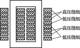繞組是變壓器的電路部分。它由漆包線或絕緣的扁銅線繞制而成,有同心式和交疊式兩種。同心式繞組是將高、低壓繞組套在同一鐵芯柱的內(nèi)外兩層,如圖3-7所示。交疊式繞組的高、低壓繞組是沿軸向交疊放置的,如圖3-8所示。