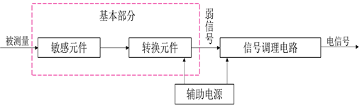 傳感器通常由敏感元件、轉(zhuǎn)換元件及信號調(diào)理電路組成,有時還包括輔助電源。傳感器的組成框圖如圖1-1所示。其中敏感元件和轉(zhuǎn)換元件為傳感器的基本組成部分,分別完成檢測和轉(zhuǎn)換兩個基本功能。但只由敏感元件和轉(zhuǎn)換元件組成的傳感器,其輸出信號通常較弱,這就需要信號調(diào)理電路將輸出信號進行放大并轉(zhuǎn)換成易于傳輸、便于處理的可用輸出信號。