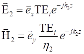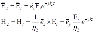 在第二種媒質(zhì)中,只有向正Z軸方向傳播的透射波,它的電場強(qiáng)度和磁場強(qiáng)度可表示為:
