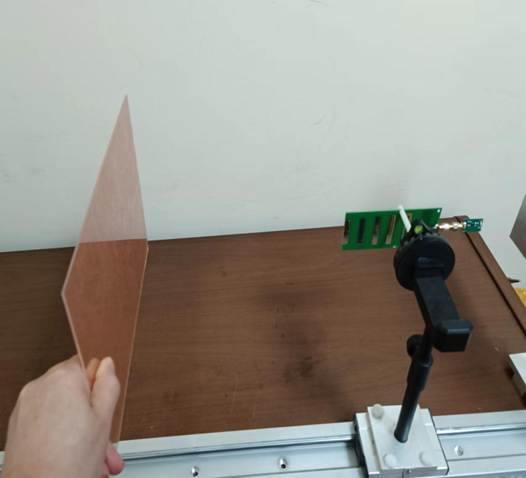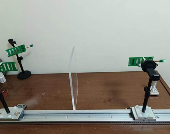 6)將有機(jī)玻璃平面放入收發(fā)天線中間,觀察LED燈的變化。
