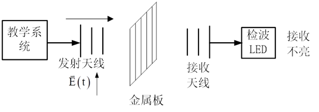 4)將平面金屬板放入收發(fā)天線中間,如圖4所示,電磁場不能穿投導(dǎo)體板,按下發(fā)射開關(guān),此時電磁波發(fā)射出來,觀察LED燈是否被點亮。LED燈不亮。說明電磁波被導(dǎo)體板屏蔽了。