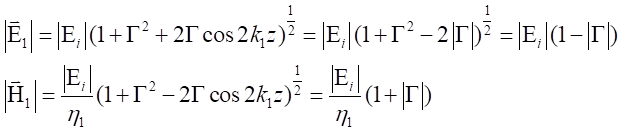 如果G>0,則在cos2k1z=1或(n=0,1,2,¼¼)處,電場強(qiáng)度的振幅值最大,   。但在這些點上,磁場強(qiáng)度的振幅值最小,所以電場的波腹點就是磁場的波節(jié)點,在cos2k1=-1,也就是; 處,電場強(qiáng)度振幅最小,為|E|(1-G)>0,但在這些點上磁場強(qiáng)度振幅達(dá)到最大值,如果G<0,(n=0,1,2, ¼¼)處電場強(qiáng)度的振幅最小,