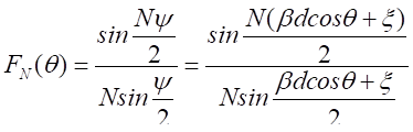 天線陣的總輻射場(chǎng)等于位于原點(diǎn)的陣單元輻射的場(chǎng)乘上一個(gè)因子,這個(gè)因子的出現(xiàn)是由兩個(gè)電流元排列成天線陣而出現(xiàn)的,稱陣因子。歸一化陣因子方向圖函數(shù)可以表示為: