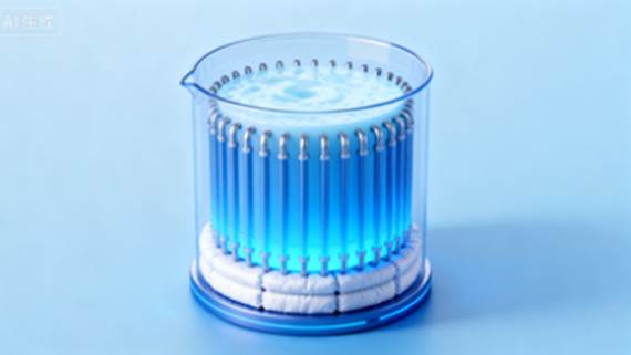 重點展示裝置結(jié)構(gòu)(含容器、石蠟、換熱管、保溫層)。風(fēng)格為簡約科技風(fēng),藍(lán)色調(diào)為主,突出熱量流動示意(紅色箭頭表吸熱,藍(lán)色箭頭表放熱)。