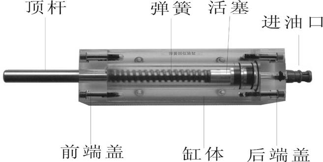 2、雙作用油缸的缸體,端蓋,行程撞塊,撞塊支撐等均采用了進(jìn)口透明有機(jī)玻璃材料。頂桿采用了45#中碳鋼,并配合油接頭,密封圈,內(nèi)六角螺絲等標(biāo)準(zhǔn)件精制而成。能通過(guò)它明確地觀察活塞、頂桿、油封、油孔等結(jié)構(gòu)及其運(yùn)行過(guò)程。