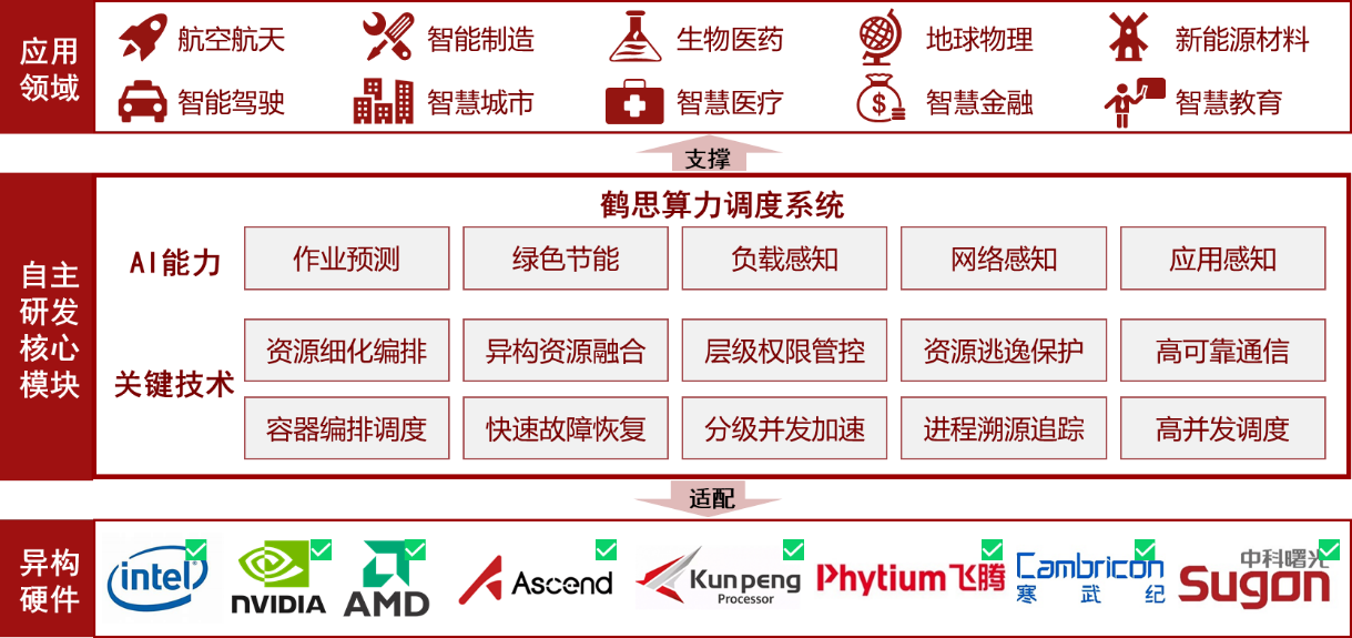 國產(chǎn)算力生態(tài)構建。作為國內(nèi)首個開源超智算調度解決方案,鶴思系統(tǒng)通過深度適配華為、飛騰、海光等國產(chǎn)芯片及操作系統(tǒng),構建起自主可控的算力調度生態(tài)體系,徹底打破國外技術壟斷。這一突破不僅填補了國產(chǎn)超算智算融合調度領域的空白,更帶動信創(chuàng)產(chǎn)業(yè)鏈上下游企業(yè)協(xié)同發(fā)展,形成從硬件到軟件的全鏈條國產(chǎn)化替代能力。